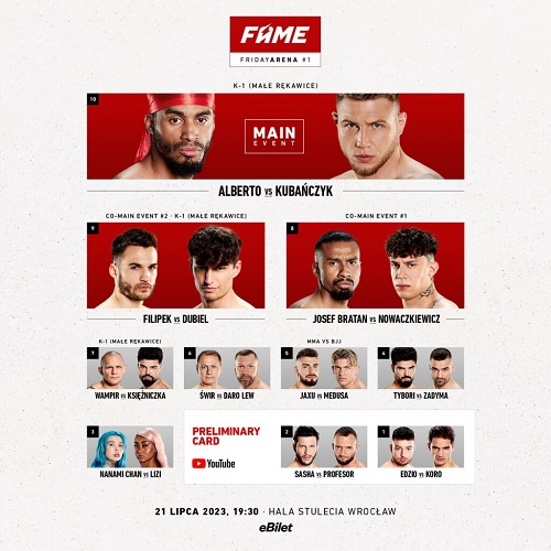 karta walk Fame Friday Arena 1: Alberto Simao - Jakub Kubańczyk Flas, MAIN EVENT Filip Filipek Marcinek - Marcin Dubiel, CO-MAIN EVENT Jose Josef Bratan Simao - Kuba Nowaczkiewicz, CO-MAIN EVENT Michał Wampir Pasternak - Paweł Księżniczka Tyburski Piotr Świr Świerczewski - Dariusz Daro Lew Kaźmierczuk Dominik Jaxu Jax - Adrian Medusa Salamon Piotr Tybori Tyburski - Tomasz Zadyma Gromadzki Olga Nanami Chan Sałacka - Elizabeth Lizi Anorue Aleksandr Sasha Muzheiko - Krystian Profesor Wilczak Piotr Edzio Bylina - Kornel Koro Regel