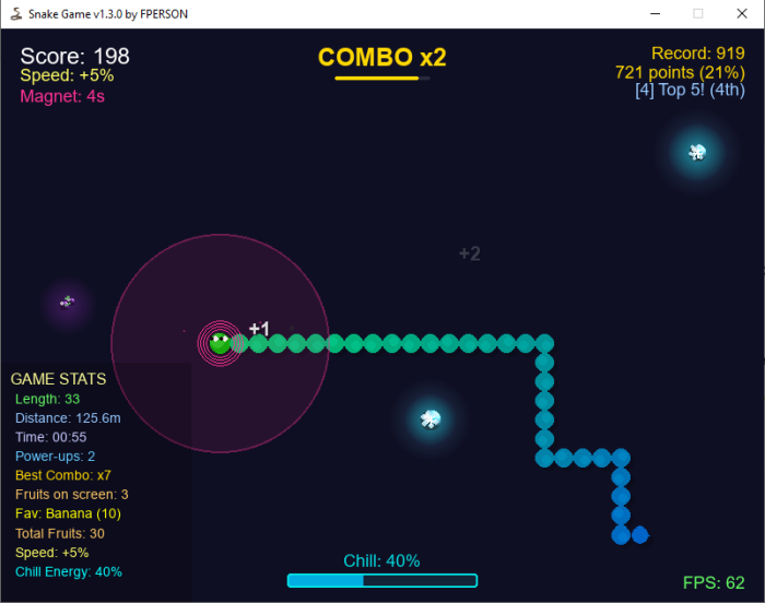 Snake Game to nowoczesna i w pełni odświeżona wersja kultowej gry arcade, znanej z klasycznych telefonów i konsol. Steruj rosnącym wężem, zbieraj kolorowe owoce, unikaj kolizji i sprawdź, jak daleko możesz zajść w tej uzależniającej grze zręcznościowej. To idealne połączenie nostalgii i nowoczesnych mechanik, zapewniające godziny angażującej rozgrywki. Główne Funkcje i Mechaniki: Płynna Rozgrywka: Gra działa w 60 klatkach na sekundę, oferując responsywne sterowanie i gładkie animacje. System Power-upów: W grze dostępnych jest 5 unikalnych ulepszeń tymczasowych: Speed Boost: Tymczasowo zwiększa prędkość węża. Magnet: Przyciąga owoce w kierunku węża Double Points: Podwaja zdobywane punkty. Shrink: Natychmiastowo skraca długość węża. Shield: Daje tymczasową odporność na kolizje. Różnorodne Owoce: Zbieraj różne rodzaje owoców, z których każdy oferuje inną liczbę punktów i efektów. Specjalne owoce, jak Złoty Owoc czy Chill Fruit, oferują dodatkowe korzyści. Mechanika Chill Energy: Zbieraj specjalne owoce, aby naładować licznik energii, który pozwala aktywować spowolnienie czasu, ułatwiając unikanie kolizji. Dynamiczna Atmosfera: Dynamiczne efekty pogodowe, takie jak opady deszczu i śniegu, dodają głębi i klimatu rozgrywce. Zaawansowane Statystyki i Opcje: Na ekranie na żywo wyświetlane są szczegółowe statystyki. Gracz może dostosować widoczność siatki, wskaźnika FPS oraz dostosować inne elementy interfejsu. System Combo: Zbieraj owoce w szybkim tempie, aby zbudować serię i zdobywać bonusowe punkty. Tabela Wyników: System lokalnego rankingu śledzi 10 najlepszych wyników, zachęcając do ciągłej rywalizacji i bicia rekordów. Nowoczesna Oprawa Wizualna: Gra posiada stylowy, ciemny interfejs z neonowymi akcentami, animowanym tłem i efektami wizualnymi. Niskie Wymagania Sprzętowe: Gra jest zoptymalizowana i działa płynnie nawet na komputerach o mniejszej mocy obliczeniowej. System operacyjny: Windows 11/10 (64-bit) Na innych systemach nie testowałem.