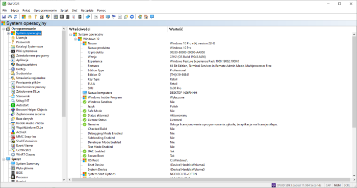 SIW (System Information for Windows) to program dostarczający szczegółowych informacji o komputerze. Wyświetla informacje o płycie głównej, systemie BIOS, procesorze, dyskach twardych i zainstalowanych urządzeniach. Ale możliwości programu nie ograniczają się do tego - ponadto program wyświetla informacje o systemie operacyjnym, programach startowych, uruchomionych procesach, bibliotekach Windows, kodekach, chronionych plikach, a nawet hasłach buforowanych.