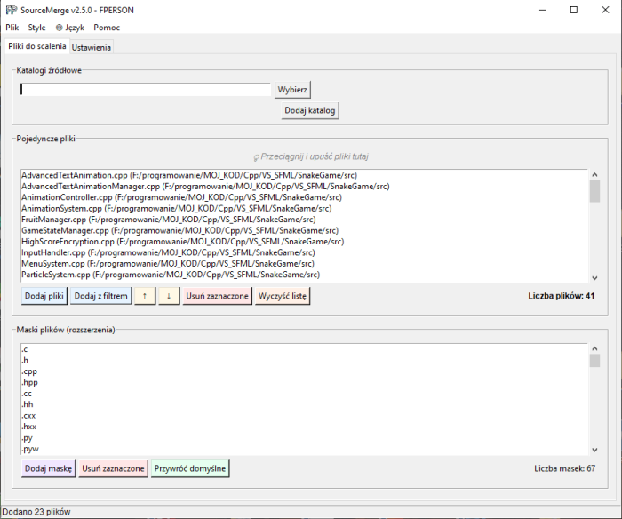 Moja aplikacja do scalania plików źródłowych. W pełni funkcjonalna aplikacja desktopowa, która umożliwia łatwe łączenie wielu plików źródłowych w jeden plik wyjściowy z konfigurowalnymi nagłówkami. Idealne narzędzie dla programistów, którzy chcą szybko przygotować kod do przeglądu, analizy lub archiwizacji. System operacyjny: Windows 11/10 (na innych nie testowałem)