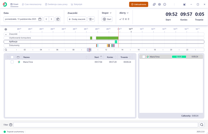 ManicTime to zaawansowane narzędzie do automatycznego monitorowania aktywności na komputerze. Działa w tle i rejestruje, jakiego programu, dokumentu lub strony internetowej używasz, dzięki czemu możesz dokładnie sprawdzić, jak spędzasz czas przed komputerem. Dane przedstawiane są w formie czytelnych wykresów i osi czasu, które pomagają analizować produktywność, rozliczać czas pracy i planować dzień bardziej efektywnie. System operacyjny: Windows 7+ (32/64-bit)