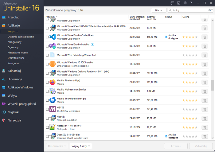 Ashampoo UnInstaller to zaawansowany program do całkowitego usuwania oprogramowania z systemu Windows, który pozwala na dokładne i bezpieczne pozbywanie się niechcianych aplikacji, w tym również tych, które pozostawiają po sobie ślady i pliki resztkowe. Główne funkcje programu: Monitorowanie instalacji Program śledzi instalację każdego programu w czasie rzeczywistym, zapisując zmiany w systemie (rejestr, pliki, foldery), co umożliwia jego całkowite usunięcie później. Pełne odinstalowywanie Ashampoo UnInstaller usuwa programy wraz z plikiami tymczasowymi, wpisami w rejestrze oraz ukrytymi folderami, które często są pomijane przez wbudowany deinstalator. Usuwanie aplikacji systemowych i preinstalowanych Można usunąć także programy fabryczne dostarczone z systemem Windows (np. „gry” czy niepotrzebne narzędzia Microsoftu). Czyszczenie systemu W zestawie są również narzędzia do czyszczenia przeglądarek, dysku, plików tymczasowych, zbędnych usług i śladów użytkowania. Tryb „Snapshot” Porównuje stan systemu „przed” i „po” instalacji, co pozwala usunąć wszystkie zmiany, jakie zostały wprowadzone przez daną aplikację. Deinstalacja zbiorcza Umożliwia usunięcie wielu programów jednocześnie. Usuwanie uporczywych programów Pozwala „wymusić” deinstalację aplikacji, których nie można normalnie usunąć. Integracja z Eksploratorem Windows Klikając prawym przyciskiem myszy na skrót programu, możesz go odinstalować bez otwierania głównego interfejsu aplikacji. System operacyjny: Windows 11/10 (32/64-bit)