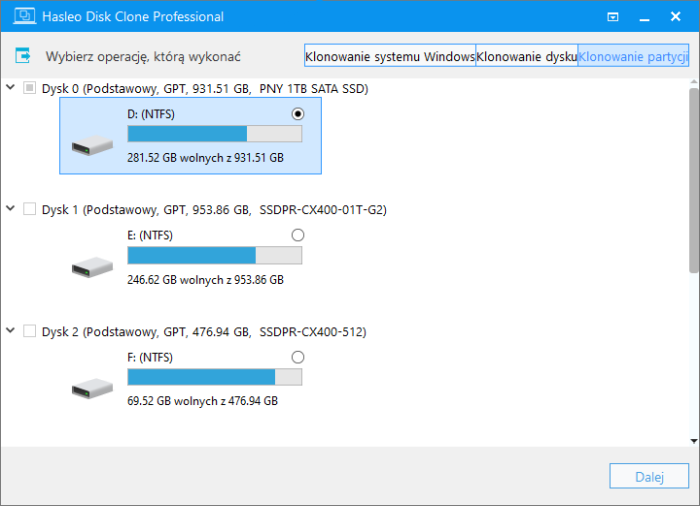 Hasleo Disk Clone to profesjonalne narzędzie do klonowania dysków i partycji dla systemu Windows. Program umożliwia użytkownikom szybkie i bezpieczne przenoszenie danych z jednego dysku na drugi - np. z HDD na SSD bez potrzeby reinstalacji systemu operacyjnego czy utraty danych. Główne funkcje Hasleo Disk Clone Klonowanie dysku Przenoszenie całego dysku (systemowego lub danych) na inny dysk. Idealne do migracji systemu z HDD na SSD lub odwrotnie. Klonowanie partycji Możliwość sklonowania wybranej partycji (np. tylko systemowej, tylko danych). Migracja systemu operacyjnego Funkcja „Migrate OS to SSD/HDD” umożliwia przeniesienie tylko systemu operacyjnego (Windows) na inny dysk, bez kopiowania wszystkich danych. Obsługa trybu „Hot Clone” Umożliwia klonowanie dysków bez konieczności restartowania komputera, czyli podczas pracy systemu. Wsparcie dla dysków MBR i GPT Kompatybilny z różnymi strukturami partycji, co pozwala na klonowanie między nimi. Automatyczne dopasowanie rozmiaru partycji Program automatycznie dopasowuje partycje do nowego dysku - może je zmniejszyć lub rozszerzyć w zależności od potrzeb. Prosty i intuicyjny interfejs Przyjazny nawet dla mniej zaawansowanych użytkowników - klonowanie odbywa się w kilku krokach. Przykładowe zastosowania Wymiana starego dysku na nowy (np. SSD). Tworzenie kopii zapasowej całego dysku. Przenoszenie systemu na mniejszy lub większy nośnik. Migracja systemu na nowy komputer (z zachowaniem konfiguracji). System operacyjny: Windows 7+ (64-bit)